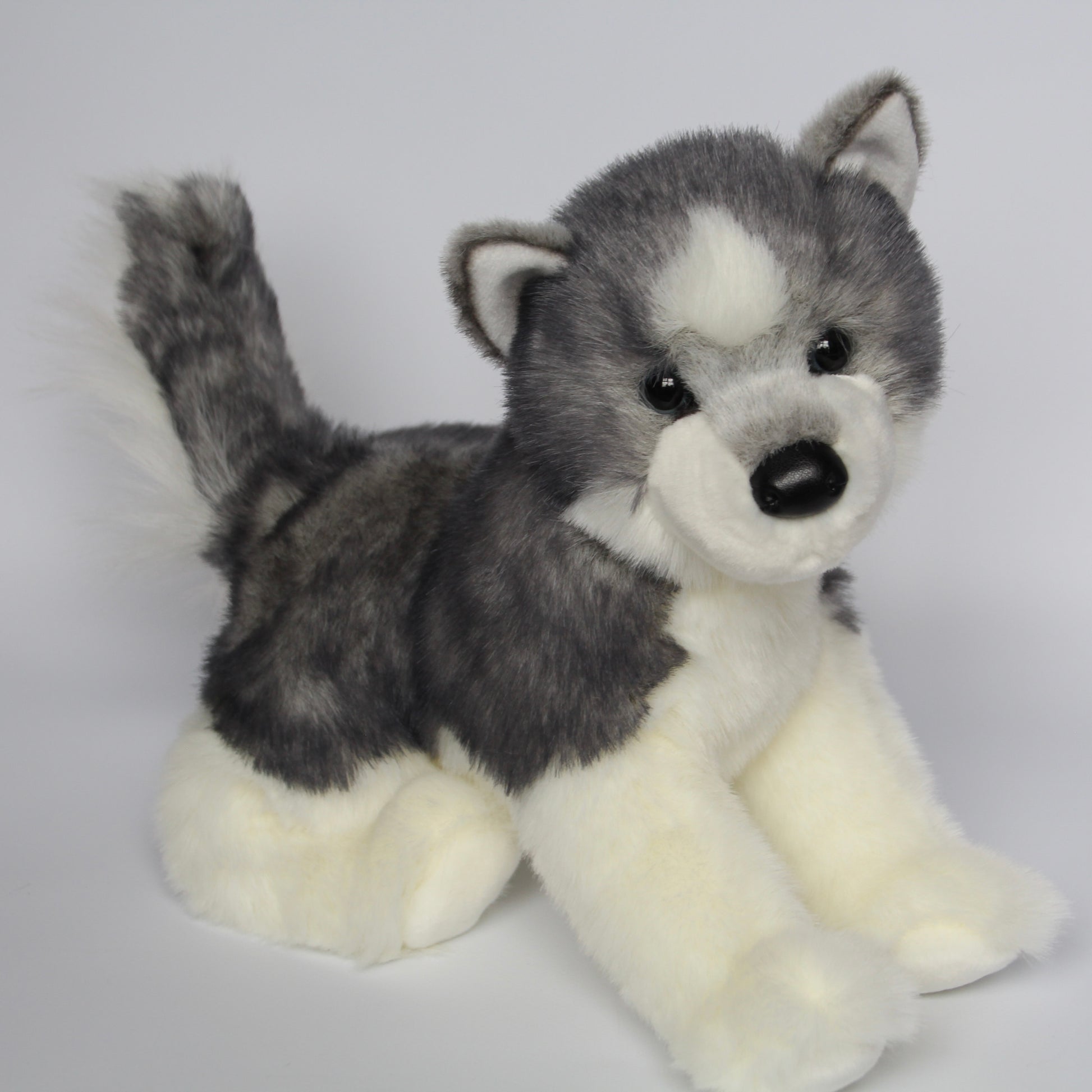 Meet Sasha, our spirited plush Husky puppy who dreams of becoming an Iditarod champion one day! She features striking silvery eyes, a soft leatherette nose, and a fluffy fringed tail. For extra realism, bean pellets have been added to Sasha’s paws that lend lifelike weight and posability to her plush body. Though the Husky breed originates in the cold, snowy North, they have affectionate, warm hearts for their families and make energetic companion dogs. Sasha the stuffed Husky pup hopes to find a home with you. She will run tirelessly by your side throughout the day and would love to cozy up and stay warm with you at night. Won’t you consider adopting this beautiful blue-eyed Husky plush?