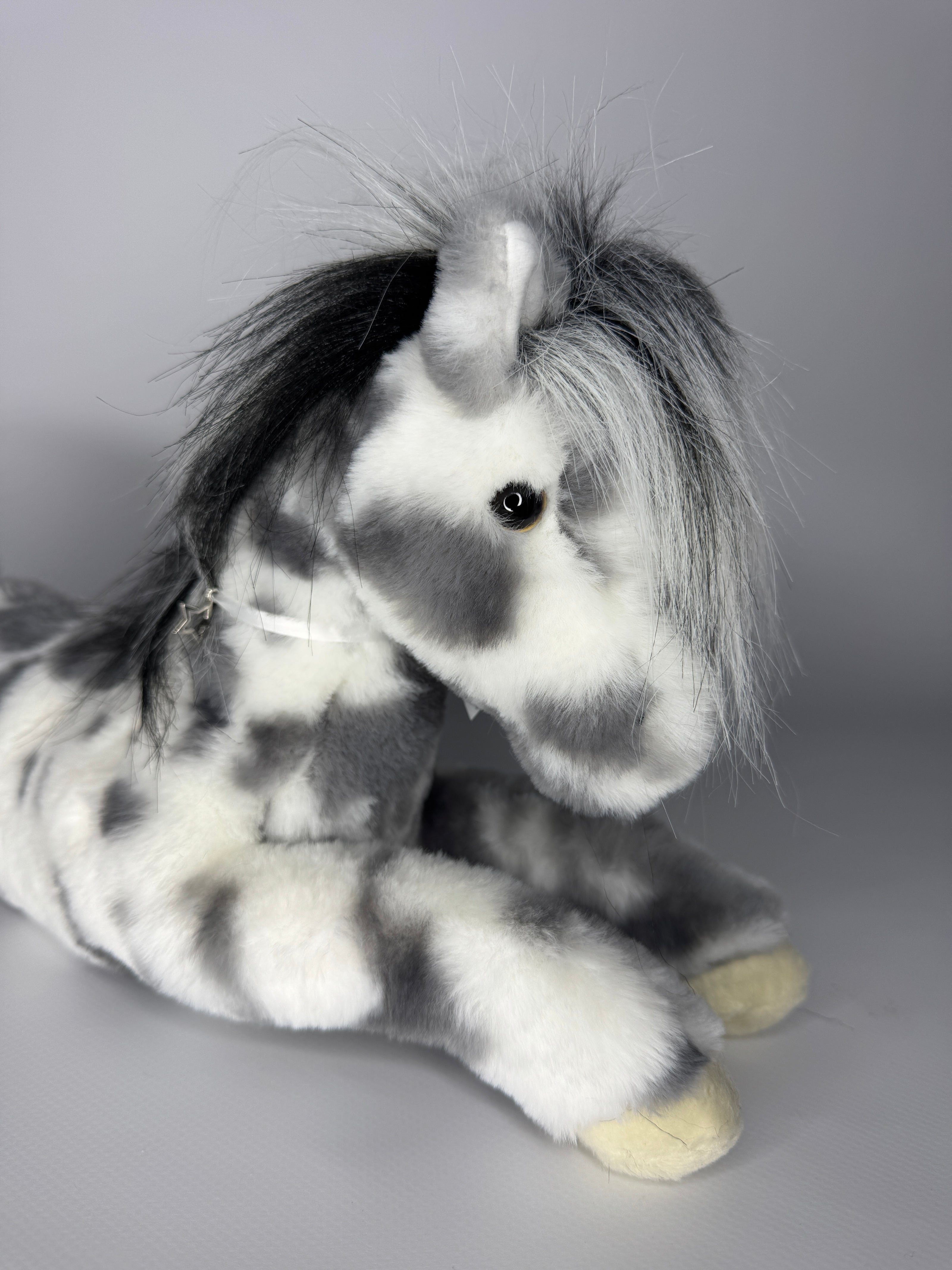 Made of stardust and fantasy wishes, Starsky the plush Appaloosa Horse will carry you away on the most fanciful of adventures! This elegant stallion features a cuddly coat with soft, gray markings. His mane and tail are made up of a combination of light and dark materials for an attractive look that begs to be pet and snuggled. With a bold glance of his warm, amber colored eyes, Starsky’s gentle expression will invite you to share your dreams with him. Crafted with resilient polyester fill and designed in a floppy, outstretched pose, you’ll find that Starsky the Appaloosa Horse stuffed animal is just as good at imaginative playtime romps as he is at cozy bedtime cuddles!