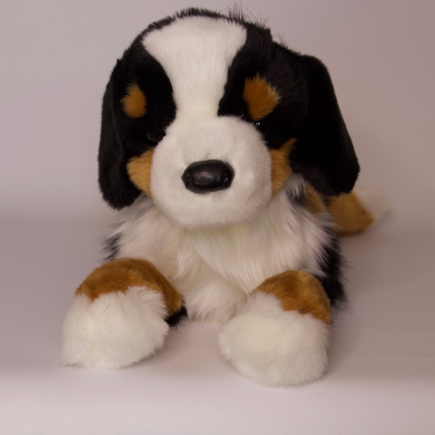 It’s a beautiful day and Trooper, our DLux Bernese Mountain Dog stuffed animal, can’t wait to hit the trails! This loyal plush pup will eagerly lead the way on every wilderness trek and will snuggle up with you once the two of you have returned back home at the end of the day. High quality plush materials are combined with resilient polyester fill and gently weighted paws to create a huggably floppy companion who’ll hold up to a lifetime of fun and adventure. His tri-color, breed specific markings will catch the eye of everyone who adores Berners. We’ve finished Trooper’s appearance with a soft, leatherette nose and large, amber colored eyes that will warm your heart. Don’t head out on a hike without him, Trooper the steadfast plush Bernese Mountain Dog will stick with you through thick and thin!